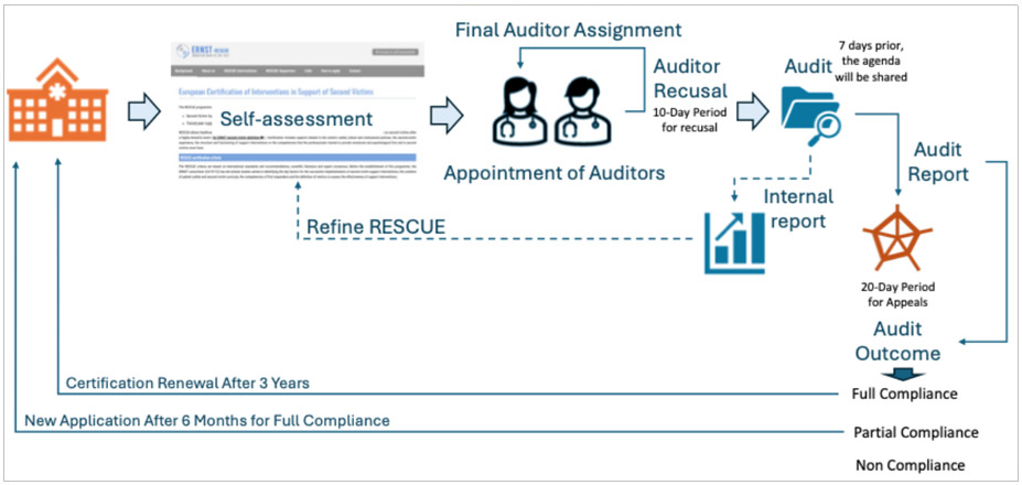 RESCUE is the result of the work conducted by the European Researchers’ Network on Second Victims (ERNST), funded by the European Cooperation in Science and Technology (COST), and validated in practice through the Innovative Grant IG19113, also funded by COST. As a general rule, the audit covers actions designed or implemented over the past three years. The certification remains valid for a period of three years, after which institutions wishing to maintain their certification must apply for renewal.